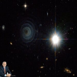 Não se sabe com certeza o que criou a estranha espiral na esquerda da imagem.No entanto, o mais provável é que seja um sistema estelar