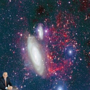 A galáxia do primeiro plano é NGC 4569 do conjunto do Virgo. Os filamentos vermelhos à direita da galáxia mostram o gás hidrogênio que foi