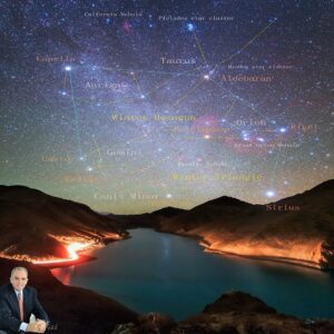 Foto obtida no Reservatório de Manla no Tibet, China. O Hexágono do Inverno (Hexágono do Verão no hemisfério Sul) é asterismo com o formato de