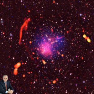Uma colisão gigante de vários clusters de galáxias, cada uma contendo centenas de galáxias, produziu esse panorama espetacular de choques e energia. As colisões geraram