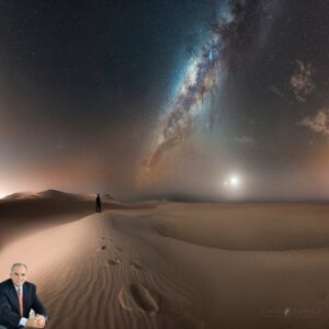 Uma linda conjunção de Vênus,Lua, homem, areia e Via Láctea.Essa imagem foi escolhida como vencedora no Concurso Internacional de Fotografia Terra e Céu 2017 do