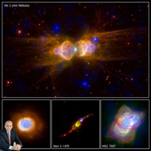 Este painel de imagens compostas mostra parte do drama do desdobramento das últimas etapas da evolução de estrelas parecidas com o sol. Nuvens alongadas dinâmicas
