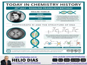 Rosalind Franklin foi uma biofísica britânica.O trabalho da Dra. Franklin, particularmente, a “Foto 51”, foi utilizado para determinar corretamente a estrutura e função do DNA.