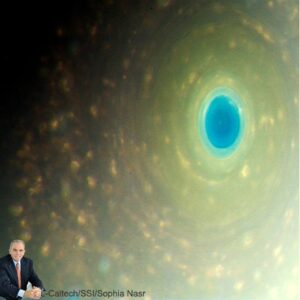 Uma imagem processada da cor verdadeira do vórtice polar de Saturno baseado nas fotos tomadas pela nave espacial Cassini em 26 de abril de 2017